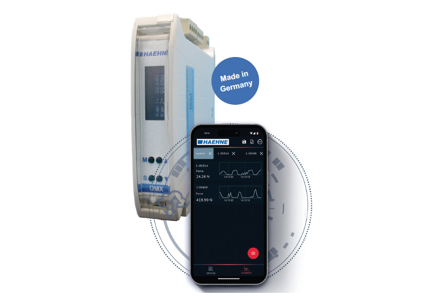 With the DMX amplifier, HAEHNE is setting new standards in the operation and commissioning of strain gauge amplifiers. The DMX is used wherever tension or linear forces are measured, evaluated, and parameterized. The user-friendly operation of the amplifier via a mobile app facilitates both calibration during commissioning and the monitoring and verification of the measured forces during operation.