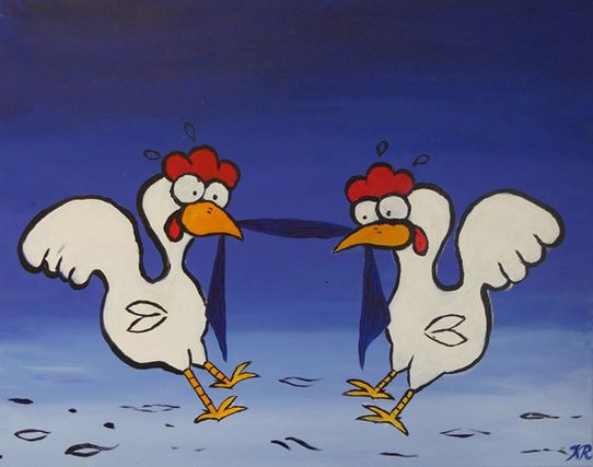 Wir brachten erfolgreich zwei Kräfte messende Hähne die an einem Band ziehen auf die Leinwände.